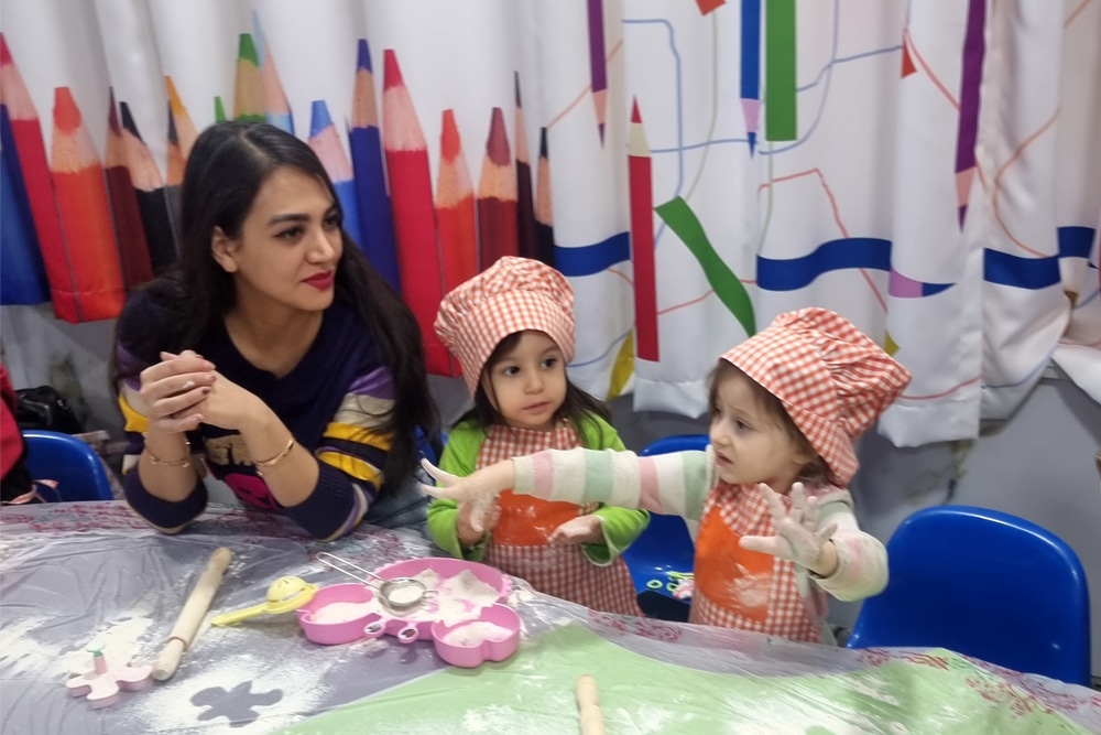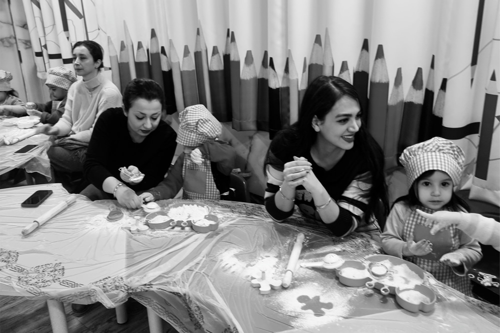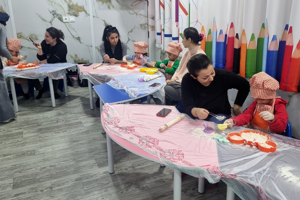 مادران و کودکان در کارگاه آشپزی، با همکاری و شادی کنار هم غذاها و خوراکیهای ساده و سالم درست میکنند. این تجربه مشترک، لحظاتی شیرین و صمیمی را برایشان رقم زده است.